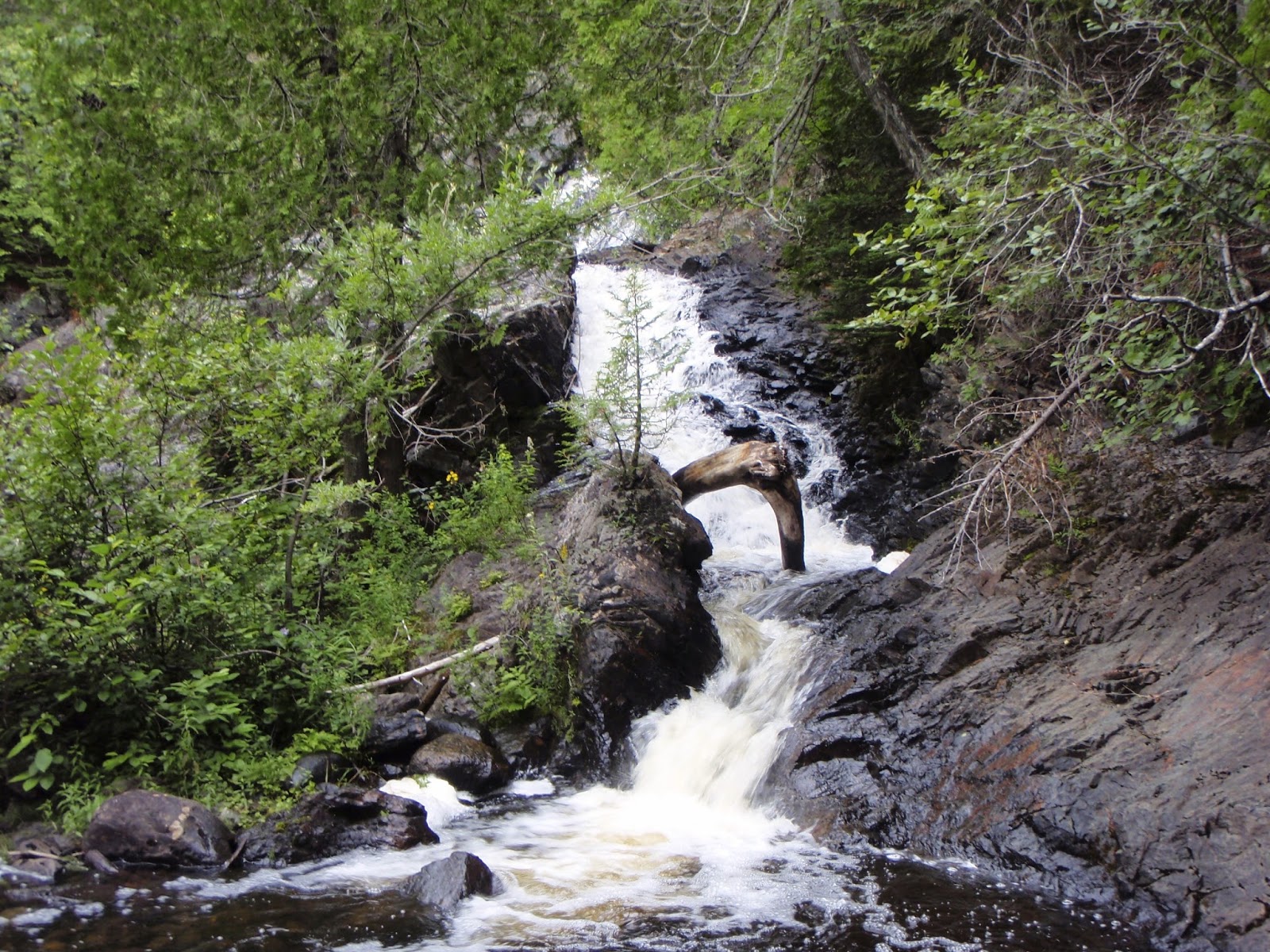 around so we picked a container full-yum. If there were bear, I wouldn't want to take their food away from them. Didn't see any caribou, which are the only inhabitants on the Lighthouse island. Paddled up a stream in our cove & found the hidden unnamed waterfalls in our cove. We could hear the falls from our boats. The waterfall is very pretty & bigger than we expected.